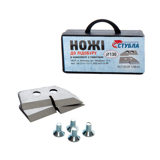ყინულის საჭრელი ბურღის პირი. შეკვაშია 2 ცალი სპეციფიკაციები: მასალა - ფოლადი 65 მმ სიგრძე: 130 მმ